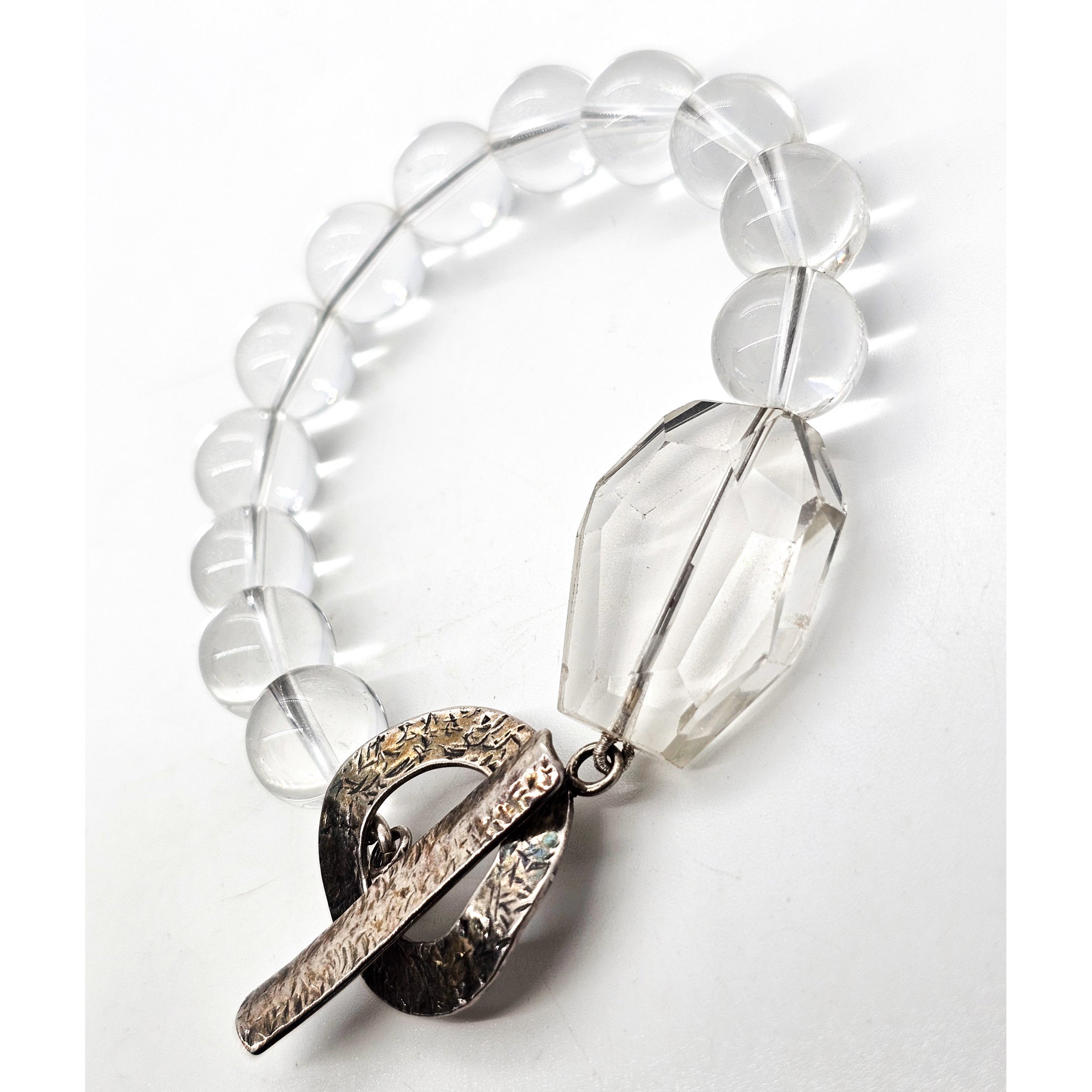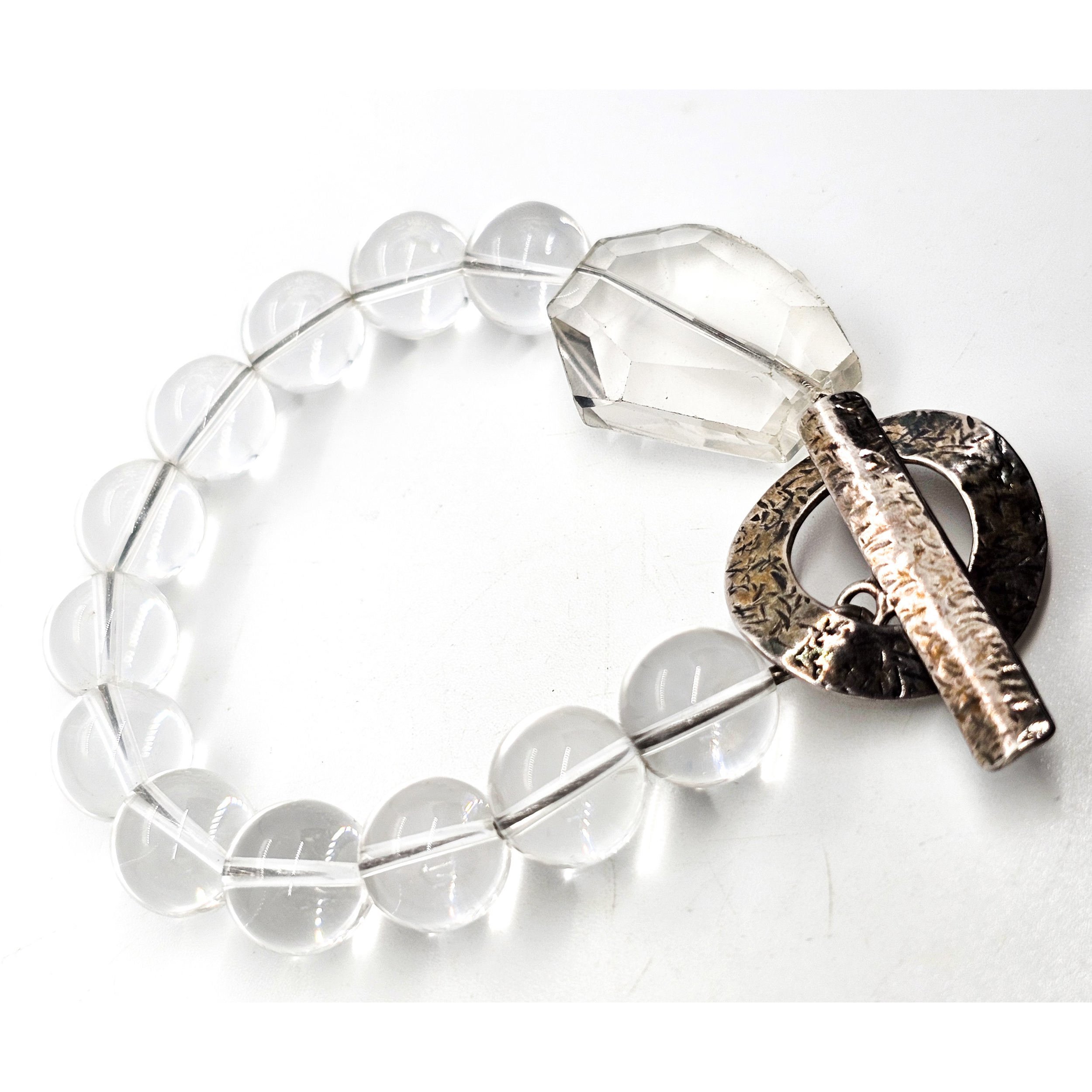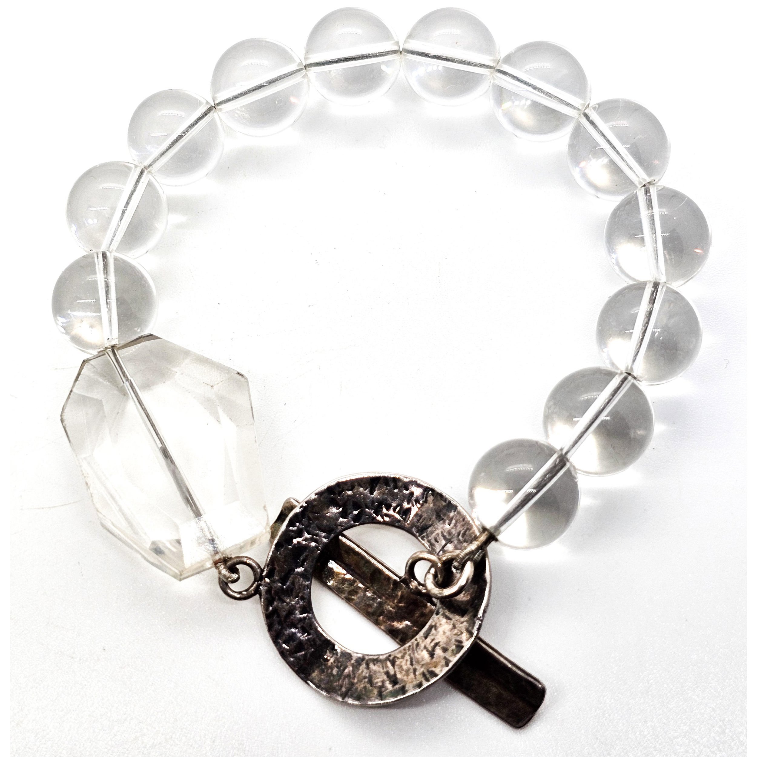 Clear Quartz gemstone beaded Sterling silver toggle clasp bracelet. Good vintage condition with little to no signs of normal wear. Clear quartz beads with one oblong faceted accent bead. Sterling silver toggle clasp. Stamped 925 on each end side of the clasp. Hammered sterling silver texture.