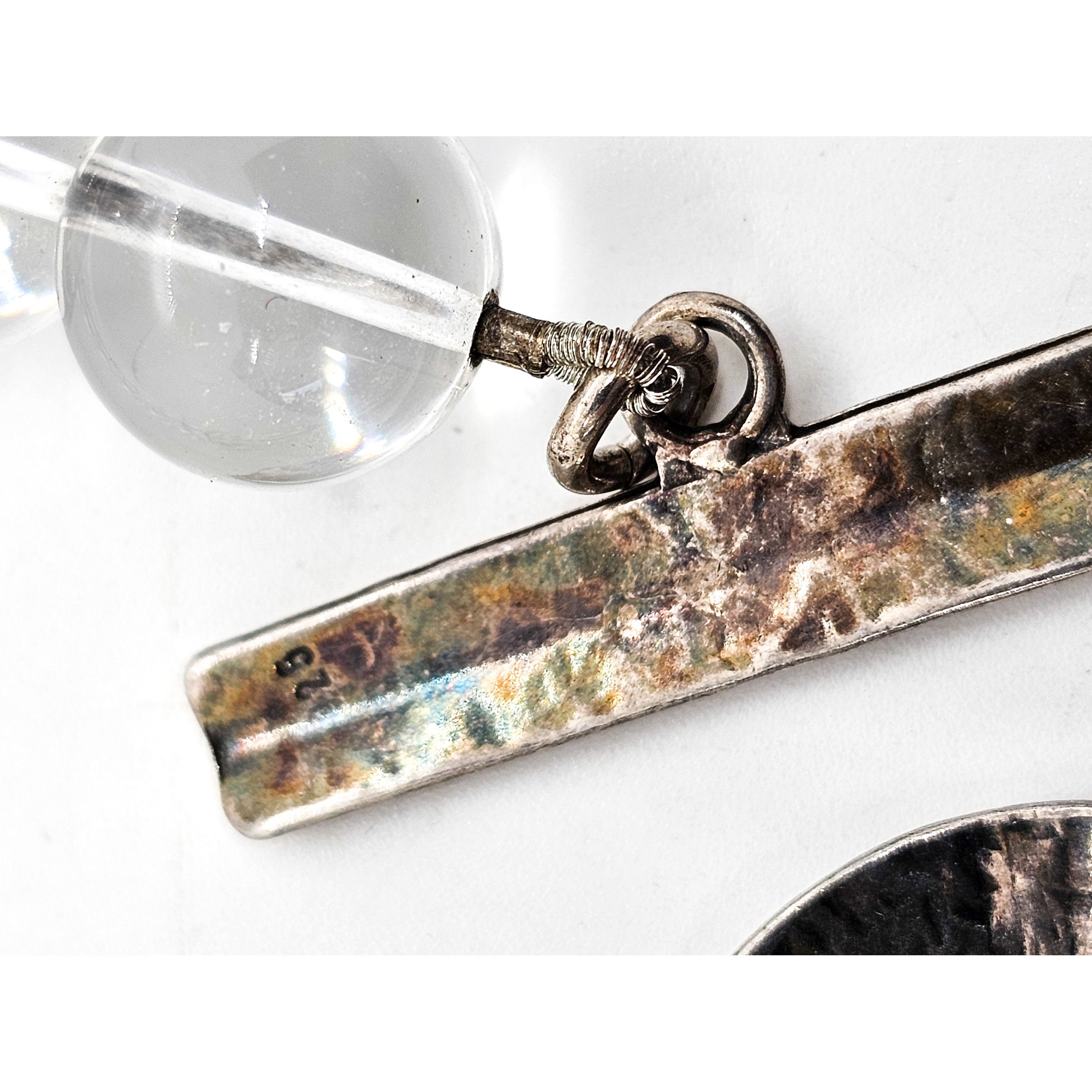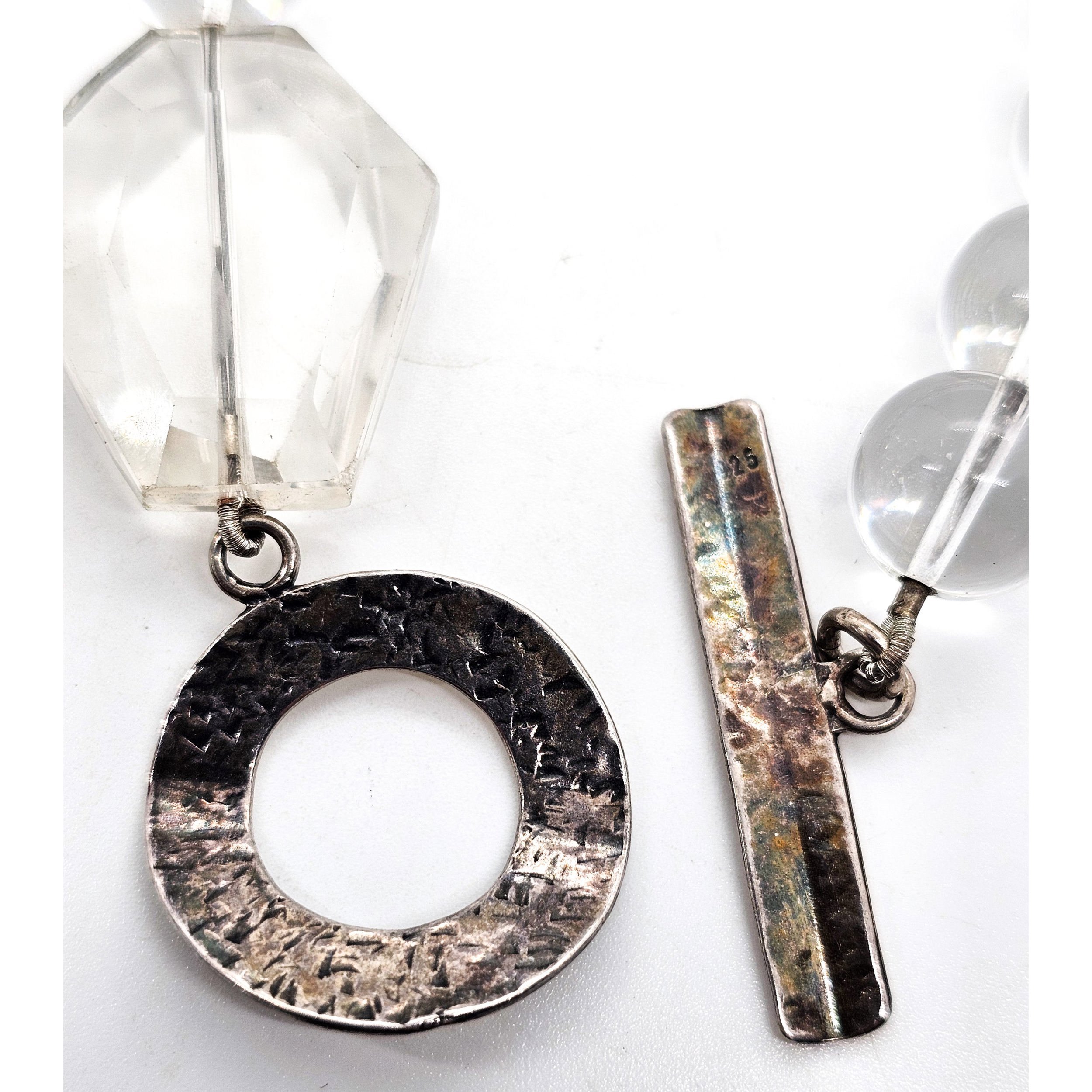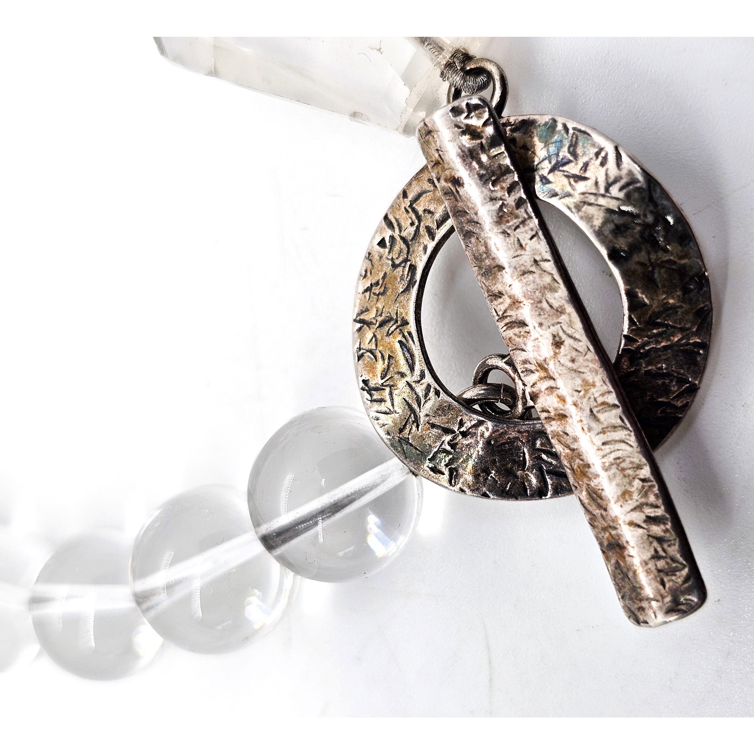 Clear Quartz gemstone beaded Sterling silver toggle clasp bracelet. Good vintage condition with little to no signs of normal wear. Clear quartz beads with one oblong faceted accent bead. Sterling silver toggle clasp. Stamped 925 on each end side of the clasp. Hammered sterling silver texture.