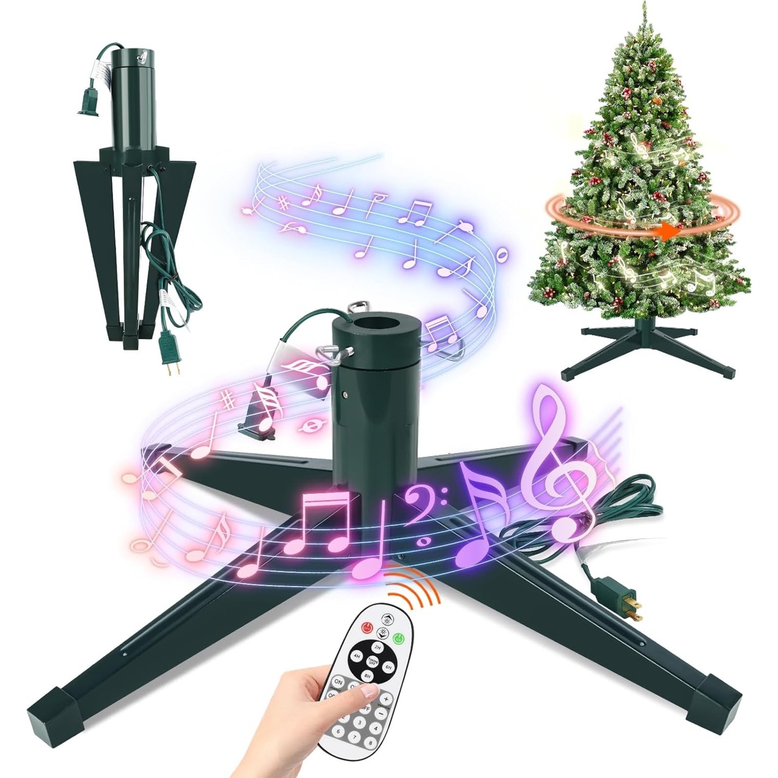 360 DEGREE ROTATION & NO WIRE TANGLES TROUBLE: The rotating Christmas tree stand can effortlessly rotate your Christmas tree, accompanied by music, allowing you to appreciate its beauty from all angles. Specially equipped sockets can directly connect Christmas lights, ensure that the Christmas tree rotates smoothly without the trouble of tangled wires MULTIPLE MODE SELECTION: Remote control control, simple and convenient. You can control the music, timing and various lighting modes as you wish. Create a cool Christmas night for you and push the Christmas atmosphere to the highest level. Your Christmas party will definitely be impressive DURABLE & STRONG SUPPORT: The artificial Christmas tree stand is made of high-quality metal, durable, with a load-bearing capacity of up to 110lb, and can support artificial Christmas trees up to 8.5FT. The support feet are wrapped in durable plastic and won't scratch your floors. The green coating blends in with the Christmas tree