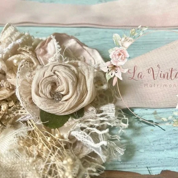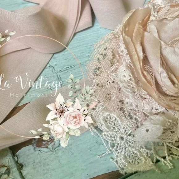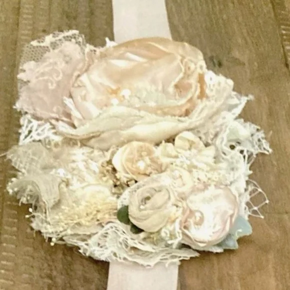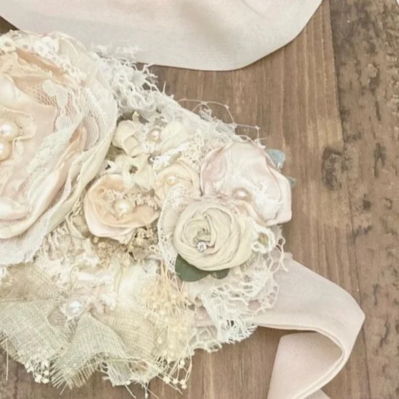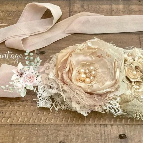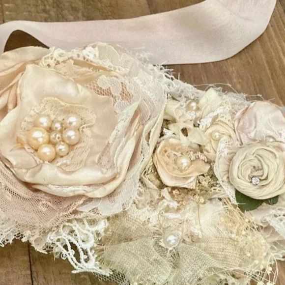 Handmade bridal belt in blush, nude, cream, ivory and champagne shades in vintage bohemian style. Your custom sash will look like the one shown here and just as pretty! Made from a variety of fine frayed fabrics which include silk, satin, lace and chiffon topped off with organic dried wildflowers and moss, vintage hand sewn champagne and ivory glass pearls, dainty clear rhinestones and dried baby’s breath. I can create this sash in any color, materials, size or accents. Send me a message for a customized design.Floral arrangement securely backed with a 6 foot, 2.5” wide blush satin sash belt. Floral arrangement measures appropriately 5”-5.5” acrossProduction time 2-6 weeks