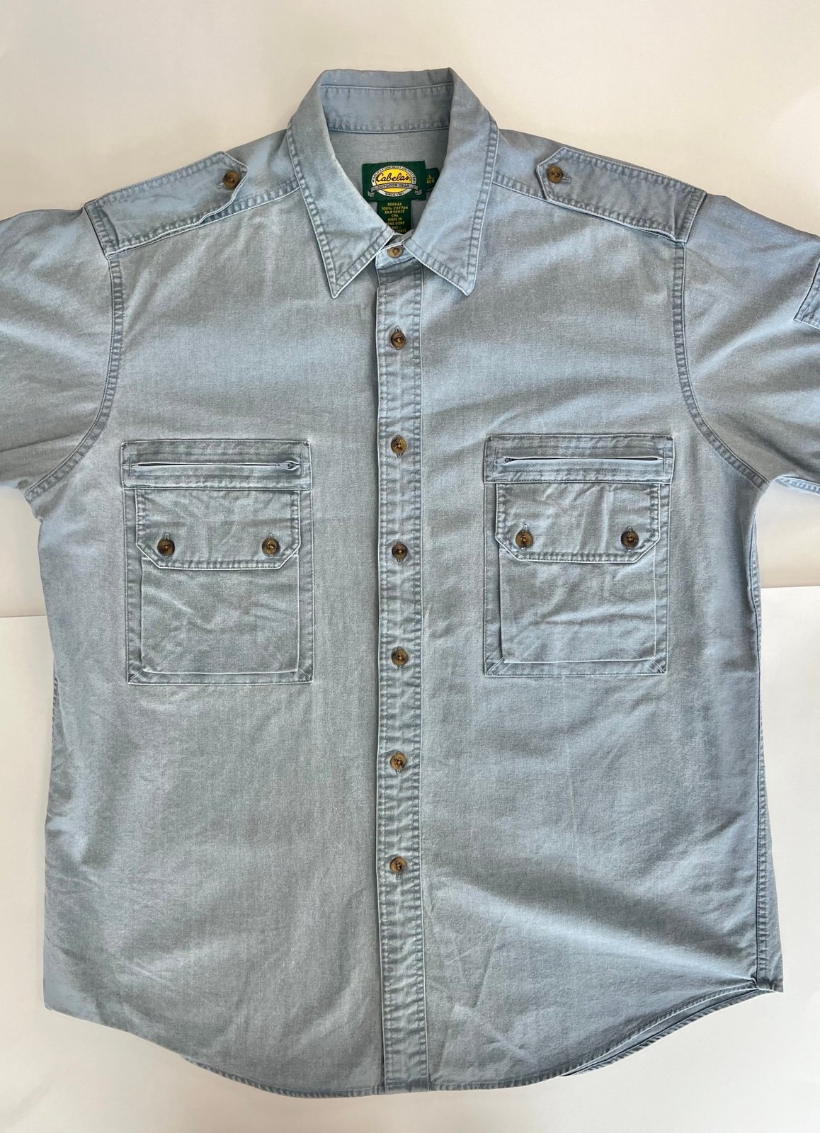 Don’t miss this vintage, heavyweight Cabela’s classic canvas button-down in light blue. High-end quality and in perfect condition, this shirt will last forever. Whether you’re blue-collar or just like to dress that way, don’t miss this one.